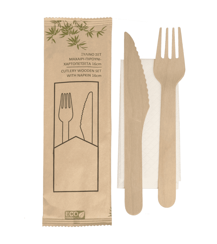 Κουβέρ ξύλινο με πιρούνι, μαχαίρι και λευκή χαρτοπετσέτα συσκευασμένο σε χάρτινο craft περιτύλιγμα 50τεμάχια*12πακέτα